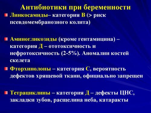 Основні побоювання щодо застосування антибактеріальних препаратів під час вагітності пов'язані з можливим ембріотоксичну дію ліків. Деякі препарати дійсно мають тератогенну ефектом (викликають патології розвитку внутрішніх органів, порушення слуху і зору), особливо якщо їх застосування сталося в першому триместрі вагітності. Другий триместр є більш безпечним періодом для проходження лікування, хоча і в цей час використання ряду антибіотиків заборонено. так: