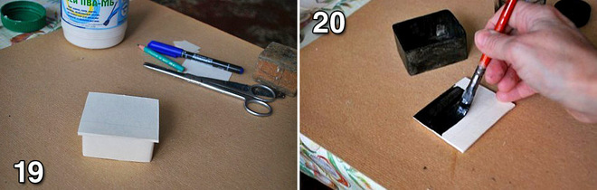 Крок 20: Скриньку покриваємо тонким шаром і даємо їй добре висохнути. Покривати треба кілька разів (4-5) поки скринька не стане рівномірно чорної. Всі нерівності на скриньці можна зачистити дрібним наждачним папером. Але робити це треба тільки тоді, коли скринька добре висохне. Перед розписом її можна ще раз покрити тушшю з клеєм.