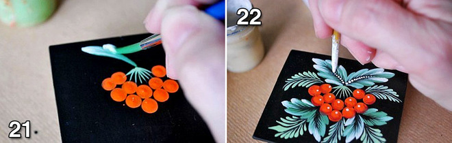 Залишилося розписати. Намалюємо калину. Ягоди я малюю піпеткою. Першу ягоду "ставлю" трохи нижче центру шкатулки.