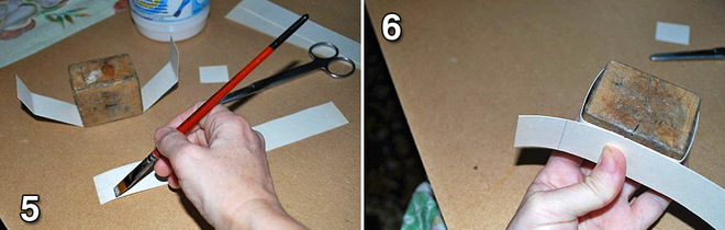 Крок 6: Приклеюємо другу смужку на першу. Спочатку закриваємо стик. Потім акуратно обертаємо смужку навколо форми. Треба стежити, щоб краї двох смужок збігалися і щільно приклеїлися один до одного.