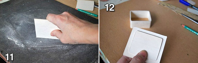 Крок 8: Після того, як всі шари картону наклеєні, треба дати заготівлі добре висохнути. Якщо скринька маленька, то вона сохне 3-4 години, а якщо велика - то добу. Після цього краю треба зачистити на наждачним папері з двох сторін.