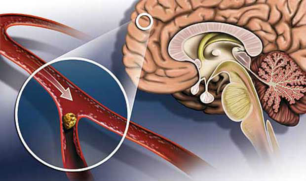 Кров з лопнув судини може потрапити в головний мозок і порушити функціонування тканин. Якщо відбувається спазм судини, кровопостачання головного мозку погіршується, і деякі його ділянки починають відмирати. Цей стан називається «ішемічний інсульт».