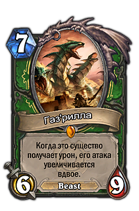 Годзилла !!! ой вибачте Газрілла найсильніша карта за 7 мани. Характеристики 6-9 просто шикарний вибір для вас, а здатність подвоювати шкоди ммм ... Шкода, що у мисливця майже немає карт які можуть її активувати. Але на арені часто трапляються Ельфійська лучниця , Ружейнік Стальгорна і підривники, які зроблять з Газрілли істота із запаморочливою атакою. Однозначно беріть, якщо дають.