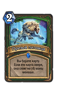 А ось в рейтингових іграх Заклик вихованця буде набагато частіше використовуватися, але не у всіх колодах. Мисливець на хрипах не буде її брати, так як вона йому ні до чого. Цей вихованець буде мотивувати гравців на створення колод на звірів і ця вже третя карта, яка зможе добре зайти в колодах контроль-ханта. Адже використовуючи цю карту через монетку на першому ходу можемо отримати Високогріва савани вартістю 2 мани і виставити його на другий хід або звіра з його дикими характеристиками. За допомогою цієї карти ми зможемо стати схожим на друїда, який через осяяння може виставляти важких істот на ранньому етапі гри.