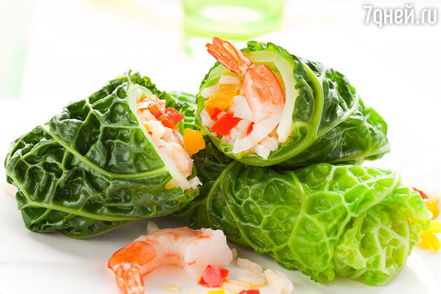 4 листа савойської капусти пару хвилин бланшувати в киплячій підсоленій воді, а потім облити холодною водою і обсушити. 150 г рису і 150 г великих очищених креветок відварити до готовності, помістити в миску, перемішати, посолити-поперчити за смаком і полити начинку 2 ст. л. соку лимона. Начинку розкласти на листі капусти і загорнути у вигляді рулетиків. У пароварку налити трохи води, помістити в неї роли і готувати їх 10 хвилин. Перед подачею на стіл розрізати кожен рол навпіл.