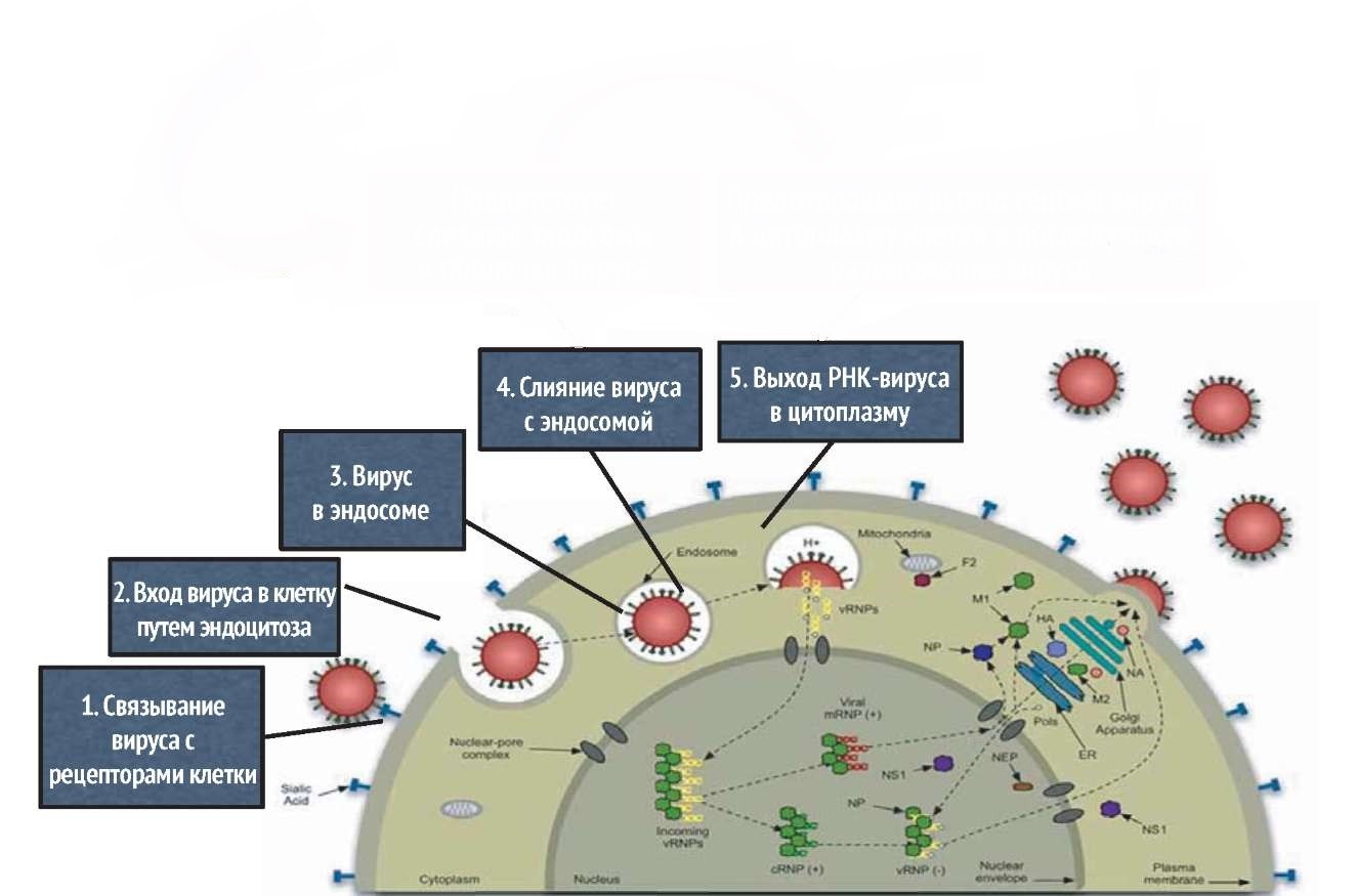 - Вихід вірусу з клітини і подальше руйнування клітини. На цьому етапі працюють противірусні препарати на основі інгібіторів нейрамінідази і противірусні антитіла.