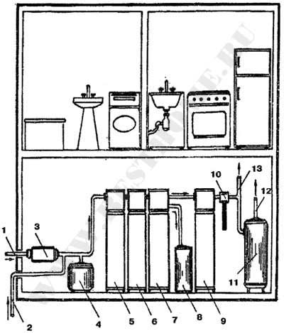 Мал. 19. Типова схема водоочистки котеджу: 1 - подача води від водопроводу; 2 - подача води від насосу; 3 - насос; 4 - пневмобаком; 5 - осадовий фільтр; 6 - фільтр знезалізнення; 7 - пом'якшувач води; 8 - бак солерозчинника; 9 - вугільний фільтр; 10 - стерилізатор ультрафіолетовий; 11 - бойлер; 12 - подача гарячої очищеної води;
