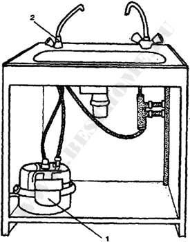 Мал. 20. Фільтр з окремим краном для питної води: 1 - фільтр "Аквафор В-150"; 2 - кран для питної води