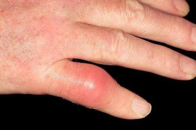 Остеомієліт - гнійне захворювання, яке вражає суглоби фаланги пальців рук і м'які тканини. Основна причина поява - гнійні бактерії. Симптоми остеомієліту - різке підвищення температури тіла, швидке погіршення стану, інтоксикація організму, блювота, озноб, біль у суглобах в пальцях рук, обмеження рухливості пальців.