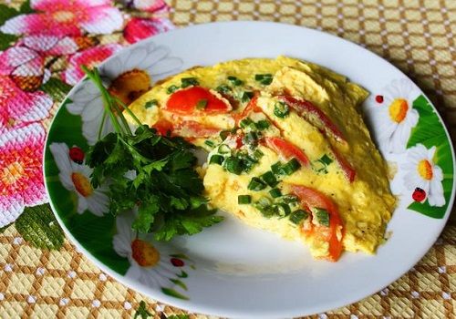 Дієтичний білковий омлет з овочами і зеленню, вишневий кисіль.