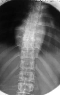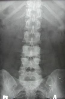 У поперековому відділі абсцес поширюється в поперековій м'язі, зображення зовнішнього контуру якої на рентгенограмі в прямій проекції стає опуклим і асиметричним при порівнянні із симетричною м'язом (рис. 10).