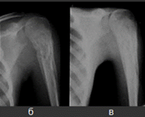 Рис.1. а) Початок кокковую остеомієліту. Неоднорідний місцевий остеопороз метафиза плечової кістки. б) Той же хворий через 1 місяць. Розпал остеомієліту.