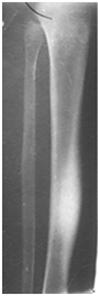 На рентгенограмахвиявляється овальної форми крайової вогнище деструкції, оточений зоною дифузного остеосклероза і потовщення кістки на рівні вогнища за рахунок періостальних нашарувань (рис. 6).