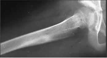 Мал. 6. остеоїдна остеома в діафіза стегнової кістки. Виражене периостальна потовщення задньої поверхні кістки і дифузний ендостальна остеосклероз, на тлі якого бобовидний вогнище деструкції.